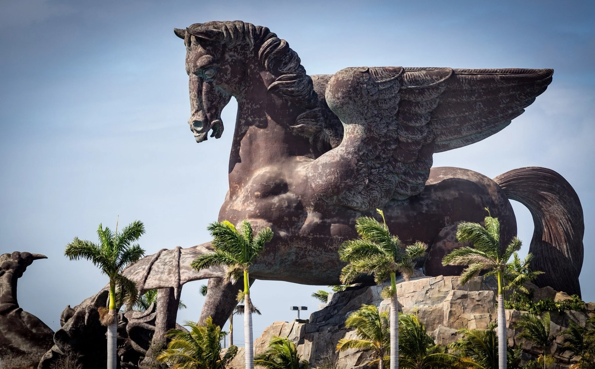The “Pegasus and Dragon” statue looms over the Gulfstream Park entrance. Photo by Steve Heuertz.