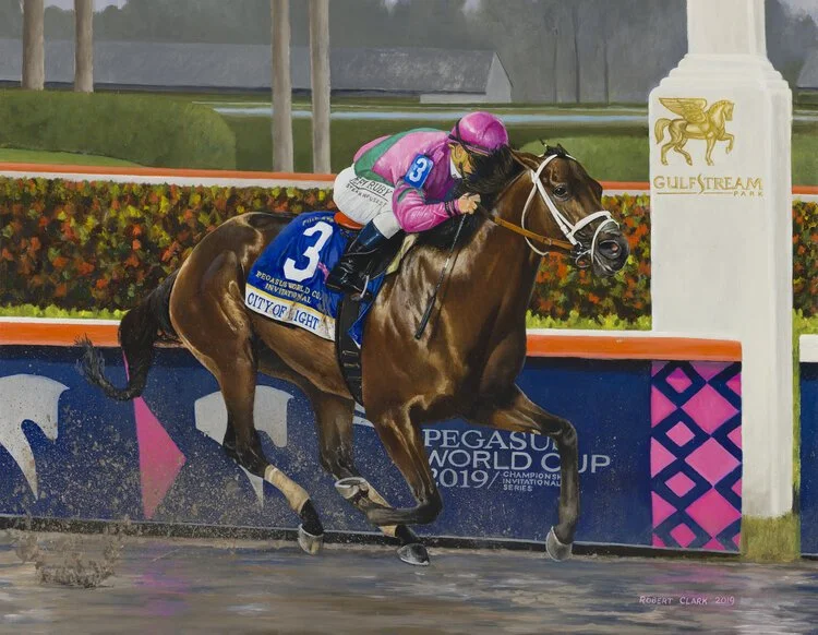 City Of LIght wining the 2019 Pegasus World Cup (G1). Painting by Robert Clark.